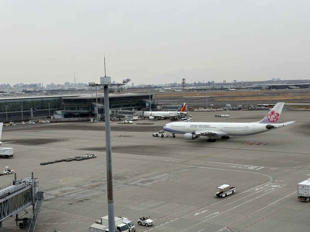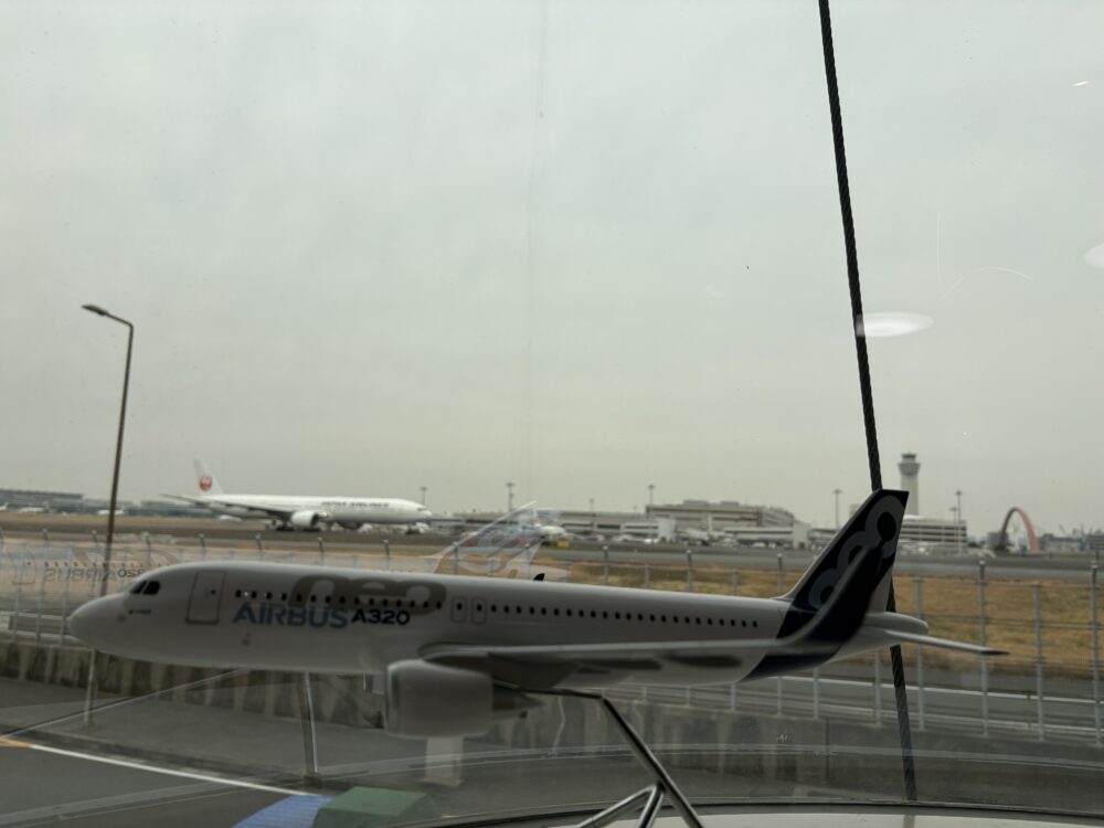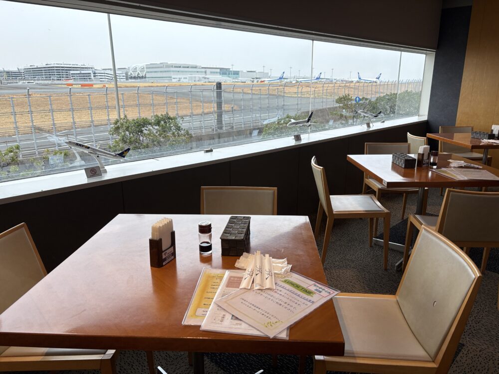 窓の外には駐機している機体や離発着する飛行機が見え、