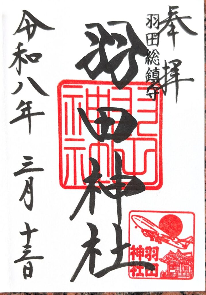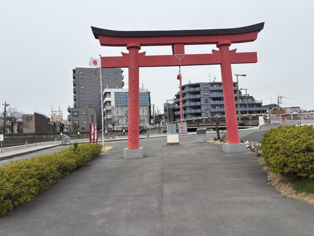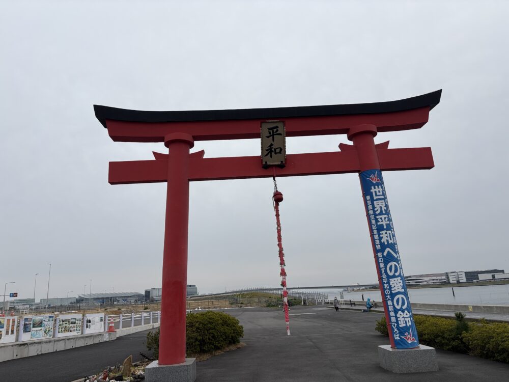 空港を背景に立つ大きな鳥居は迫力があり、羽田らしい景色だと感じます。