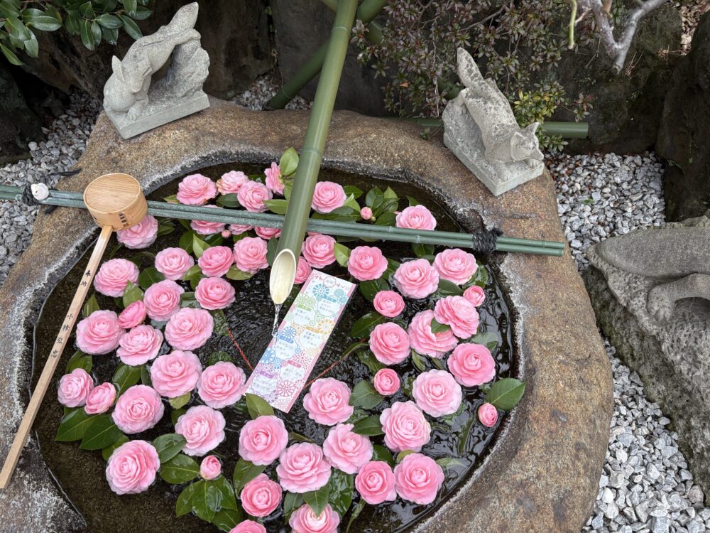 池に浮かべる「花手水柄みずみくじ」は、水に浮かべると