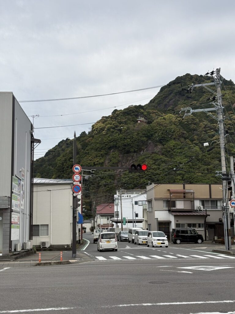 ホテルを出て交差点で信号待ちをしていると、目の前には昨日登った神倉神社が見えています。