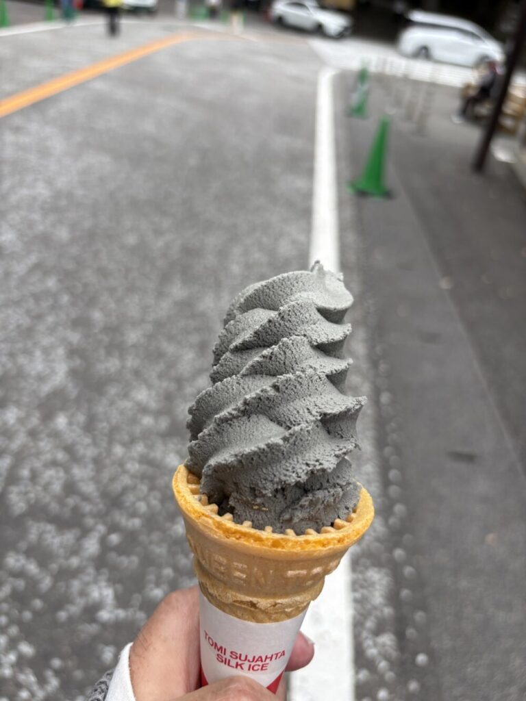 なんとか階段を登り切り、売店で購入した黒飴ソフトクリームを一口。