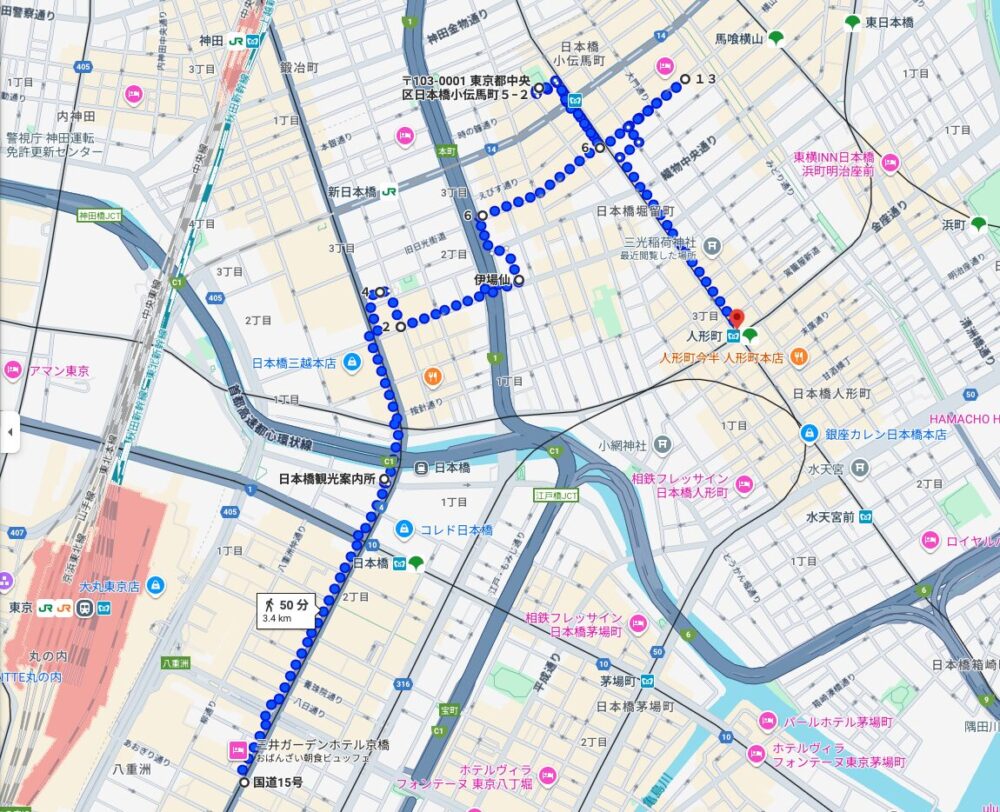 日本橋から三越前、小伝馬町、人形町へと、約4kmのコースを4時間ほどかけて散策しました。