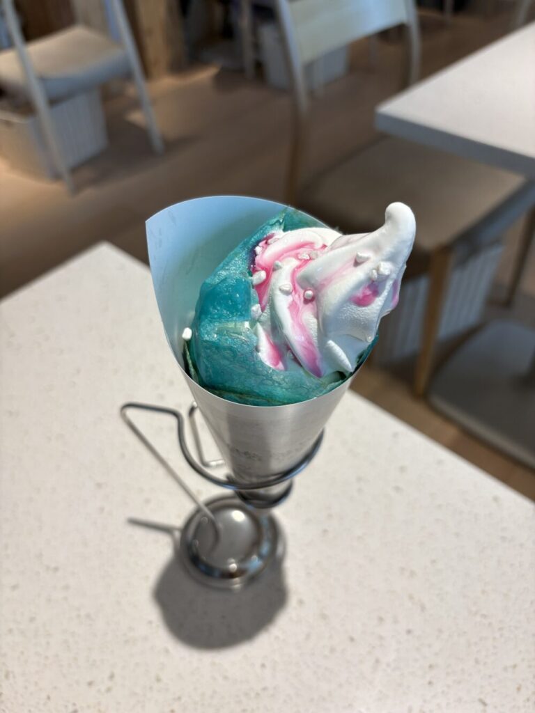 クレープにはピンク色のソースがかかっていて、みたらし味が意外なアクセントに
