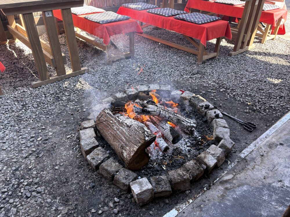 テラス席には焚き火があり、揺れる炎を眺めながらの食事は最高に贅沢な時間でした。