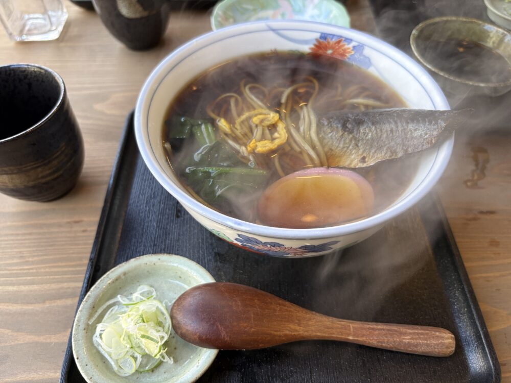 少し肌寒い日だったので、注文したのは温かい**「にしん蕎麦」。さらに、欲張って「そばがき」**も追加しました。