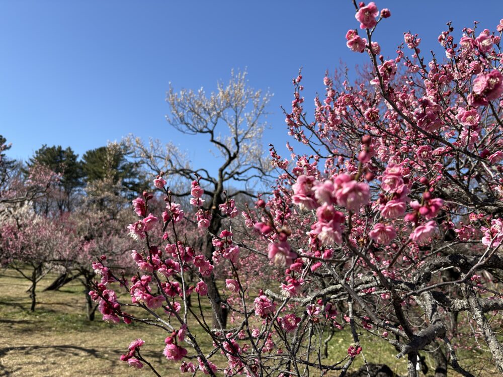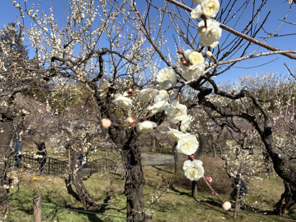 小さな橋を渡ると、そこには多種多様な梅が咲き誇っていました。